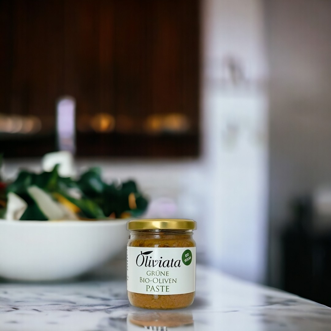 Unsere grüne Bio-Olivenpaste wird aus erlesenen grünen Oliven, ausgewählten Kräutern und nativem Bio-Olivenöl extra liebevoll hergestellt. Mit ihrem würzigen Geschmack ist sie perfekt zu geröstetem Brot, Fleisch, Fisch oder Pasta. Erstklassiger Genuss für Ihre Sinne.