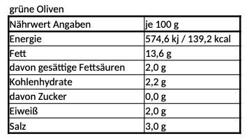 Grüne Oliven*, Trinkwasser, Salz, natives Olivenöl extra*